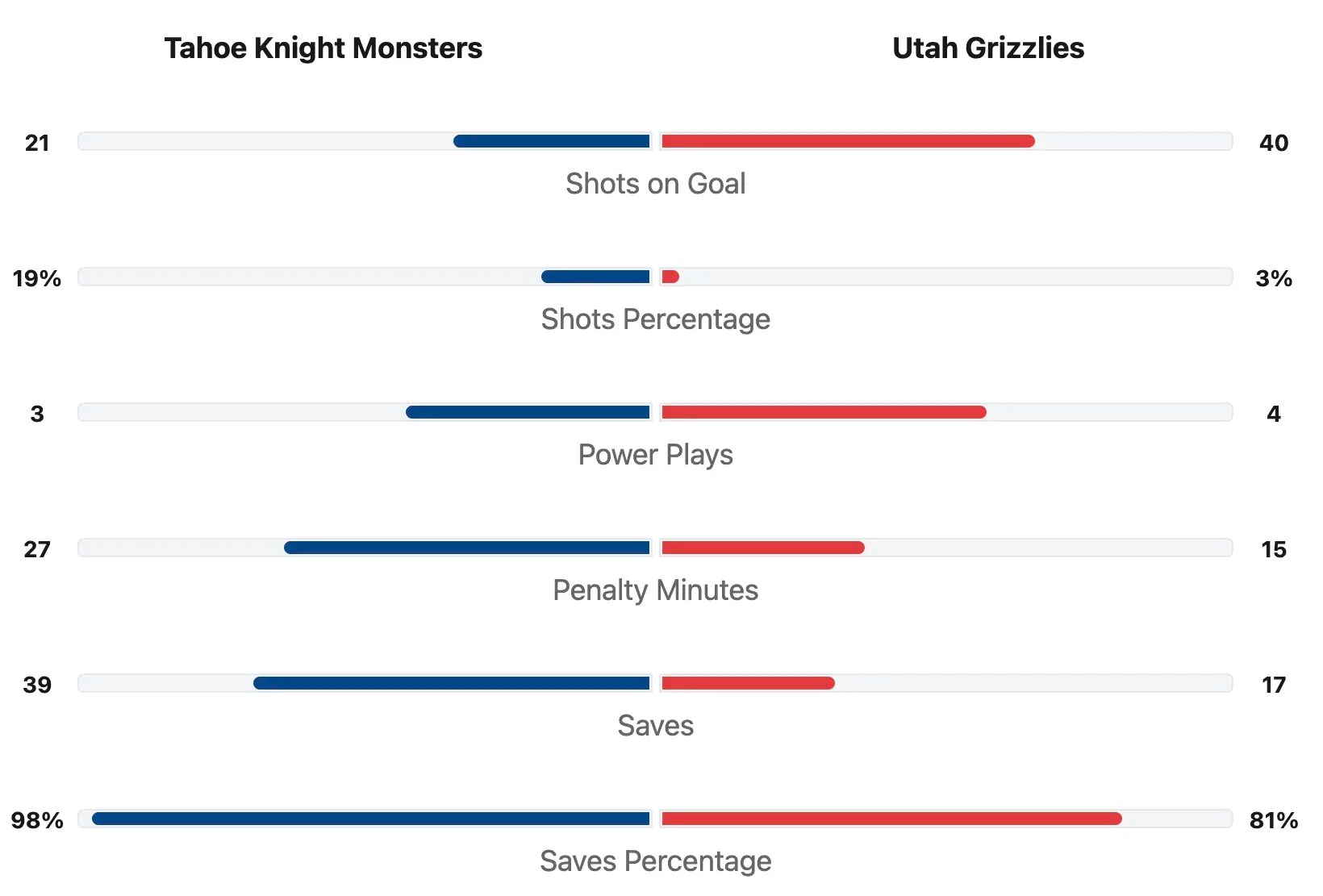 Despite the loss, Utah generated significantly more offensive pressure. The Grizzlies recorded 40 shots on goal compared to just 21 for the Knight Monsters. However, Tahoe made the most of their opportunities, finishing with a far superior shooting percentage. The Knight Monsters converted at a 19% rate, while Utah managed just 3%. Special teams were also a factor, though neither side capitalized. Tahoe finished 0-for-3 on the power play, while Utah went 0-for-4. The game was also a physical one, reflected in the penalty totals. Tahoe accumulated 27 penalty minutes, compared to 15 for Utah. Papirny delivered a standout performance in net for the Knight Monsters, stopping 39 of 40 shots for an impressive 98% save percentage. On the other side, Miska stopped 17 of 21 shots for an 81% save percentage.