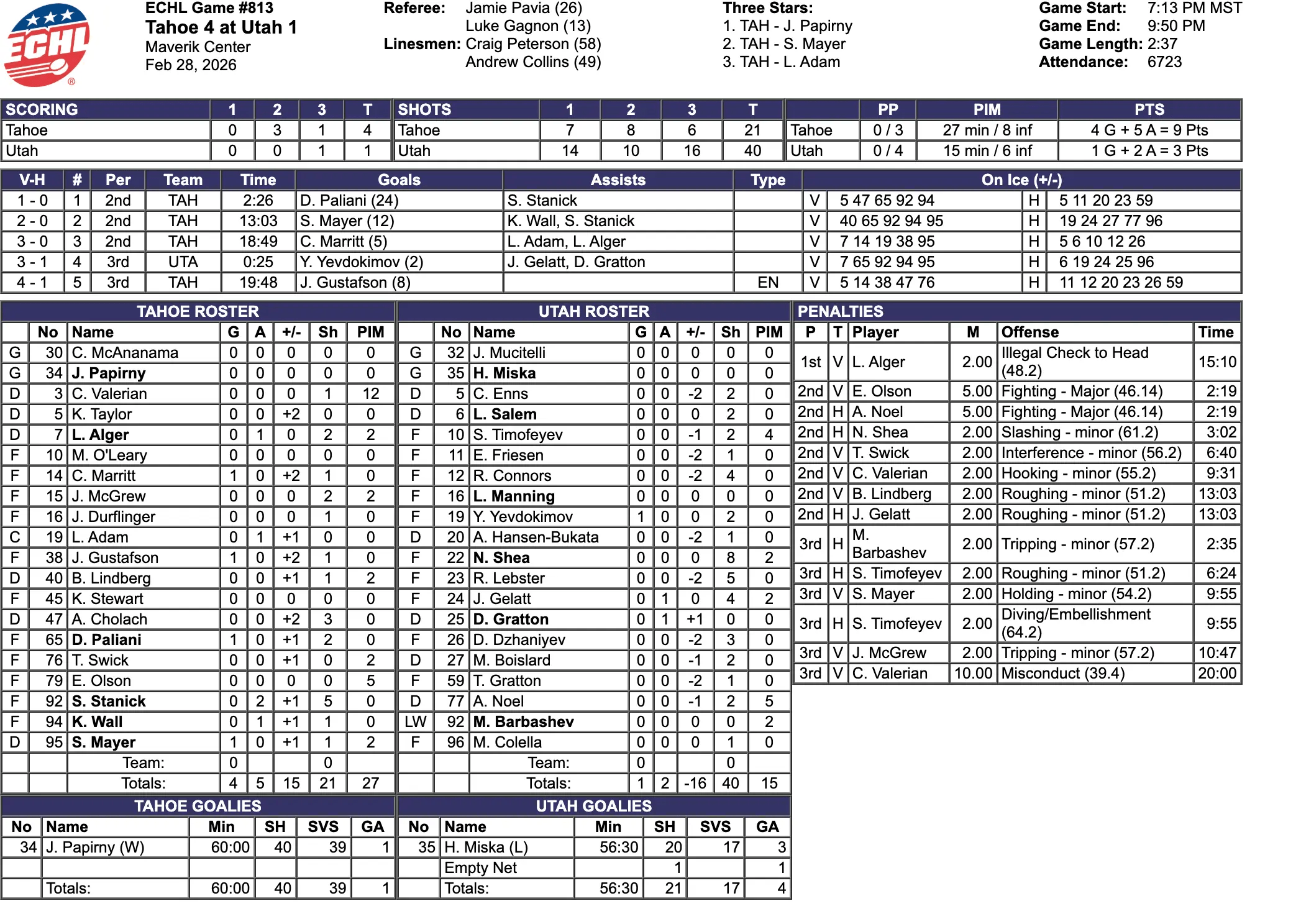 Penalties continued to shape the flow of the period. Two minutes into the third, Maxim Barbashev of Utah was called for tripping. Four minutes later, Stepan Timofeyev of Utah was penalized for roughing. At the nine-minute mark, Mayer of Tahoe was called for holding while Timofeyev was assessed an embellishment penalty on the same play. Later in the period, with under nine minutes remaining, Jake McGrew of Tahoe was called for tripping, giving Utah another opportunity to close the gap. However, the Grizzlies were unable to solve Papirny again. With Utah pushing late and their goaltender pulled for the extra attacker, Jordan Gustafson sealed the game with an empty-net goal with under a minute remaining, extending the lead to 4-1.