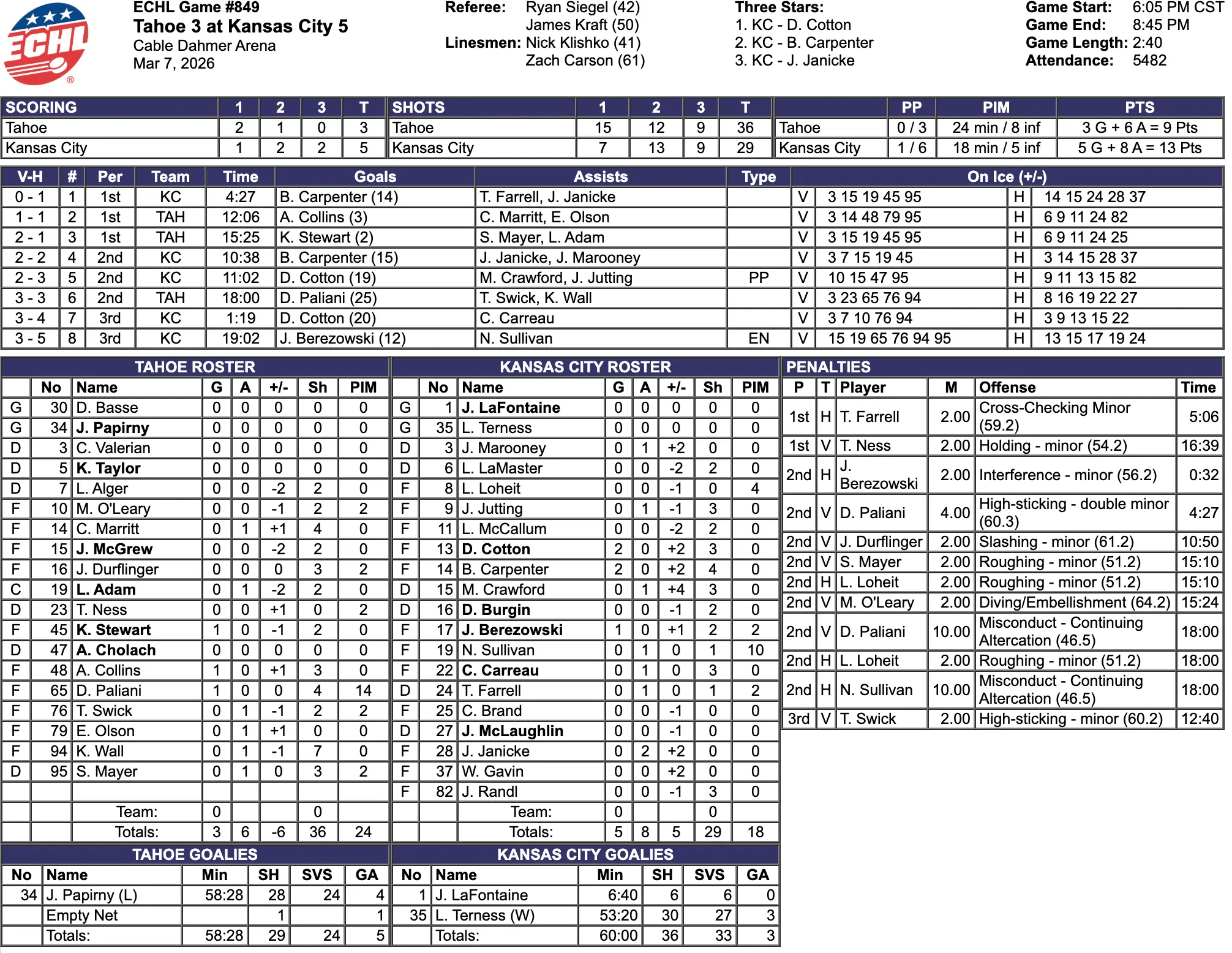 A minute into the third period, the Kansas City Mavericks took the lead. With under eight minutes left in the game, the Tahoe Knight Monsters were called for high-sticking. The Mavericks scored again with under a minute left in the game. The final score was 5-3, Kansas City Mavericks.