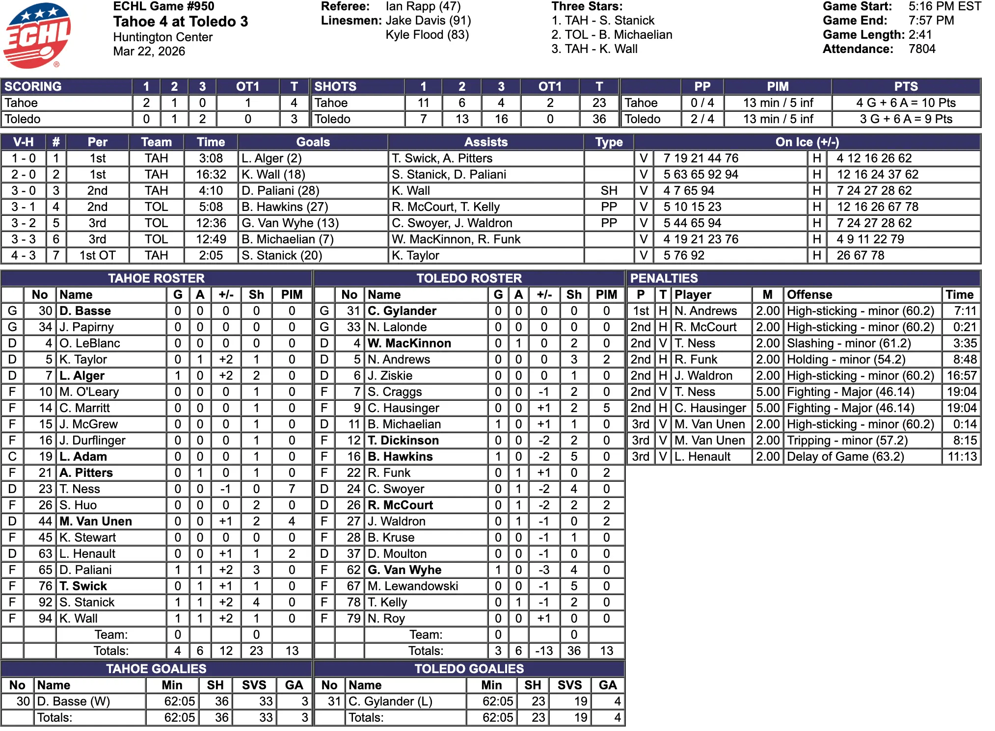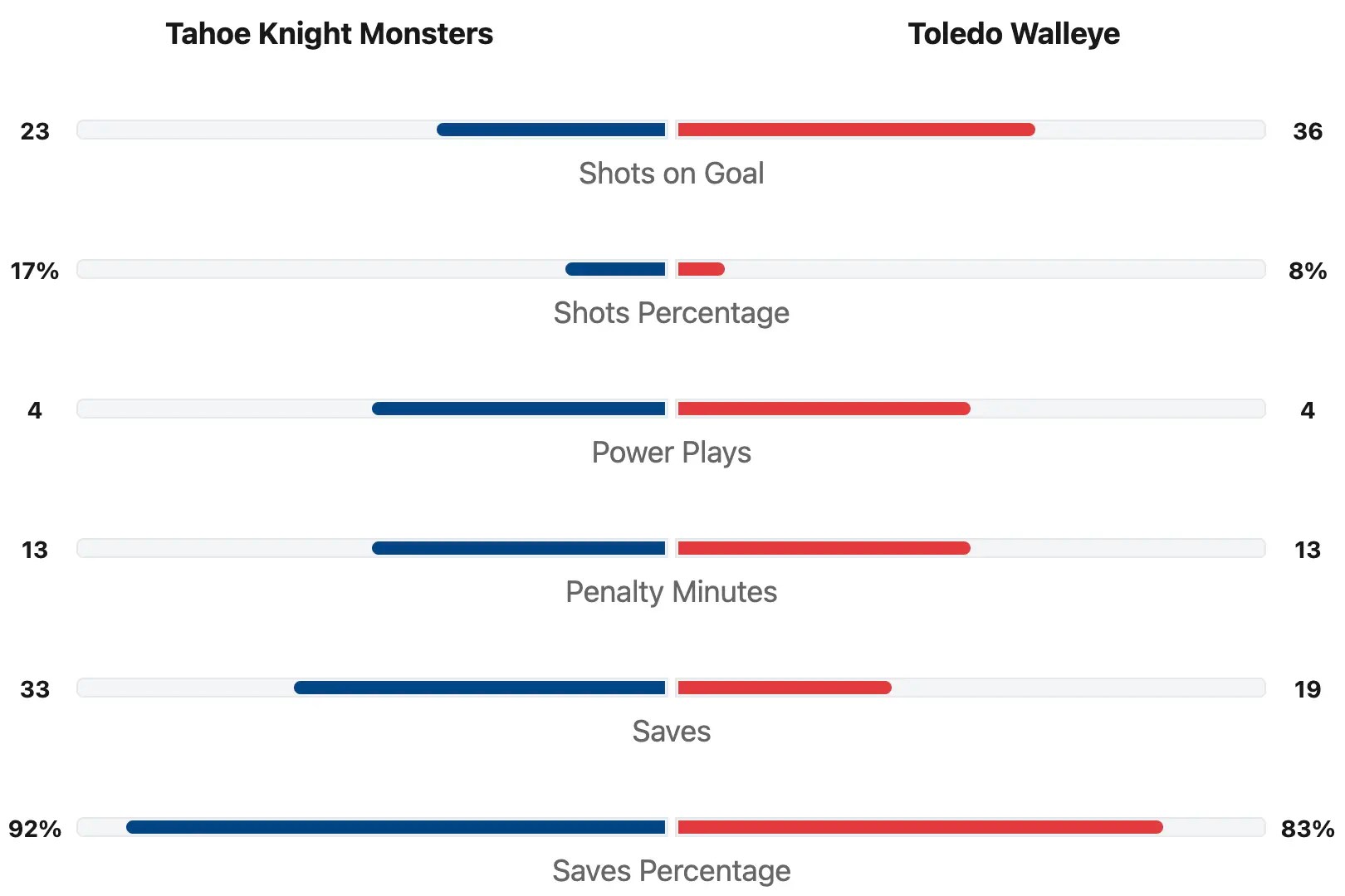 The Toledo Walleye had thirteen more shots. The Tahoe Knight Monsters had 23 total shots. The Toledo Walleye had 38 total shots. The Knight Monsters had the better shots percentage. Both teams had four power plays. Tahoe was 0 for 4 on the power play. Toledo was 2 for 4 on the power play. Tahoe also got a short handed goal. Both teams had thirteen penalty minutes. Dominic Basse saved 33 shots for a 92% save percentage for Tahoe. Carter Gylander saved 19 shots for an 83% save percentage for Toledo.