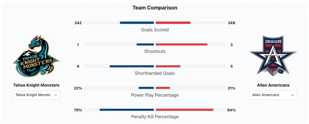 The Tahoe Knight Monsters are playing the Allen Americans. The game is at the Credit Union of Texas Event Center. The Tahoe Knight Monsters are fourth in the Mountain Division with a record of 33-29-6. The Tahoe Knight Monsters are the ECHL affiliate of the Vegas Golden Knights. The Tahoe Knight Monsters are coming off a loss to the Cincinnati Cyclones. The Allen Americans are in third place in the Mountain Division with a record of 39-23-5. The Allen Americans are the ECHL affiliate of the Ottawa Senators. The Allen Americans are coming off a win over the Wichita Thunder. The Americans have won their last seven games.