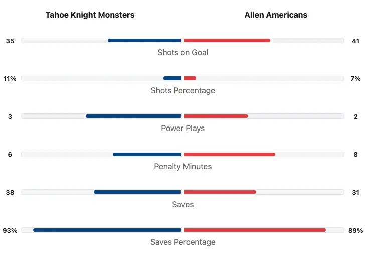 The Tahoe Knight Monsters played the Allen Americans last Saturday. The game is at the Credit Union of Texas Event Center. The Tahoe Knight Monsters were fourth in the Mountain Division with a record of 33-30-6. The Tahoe Knight Monsters are the ECHL affiliate of the Vegas Golden Knights. The Tahoe Knight Monsters were coming off a loss to the Allen Americans. The Allen Americans were in third place in the Mountain Division with a record of 40-23-5. The Allen Americans are the ECHL affiliate of the Ottawa Senators. The Allen Americans were coming off a win over the Tahoe Knight Monsters. The Americans had won their last eight games.