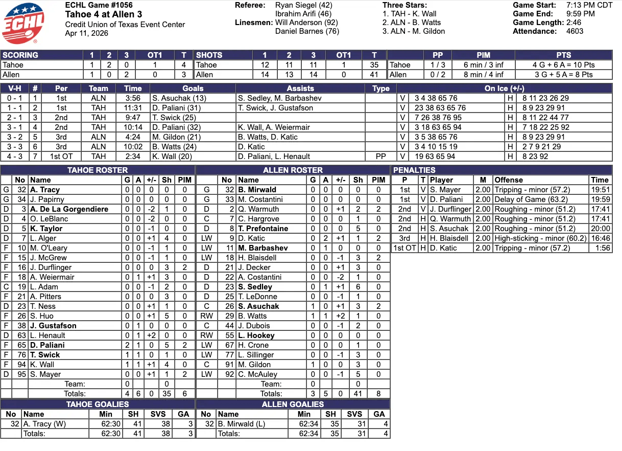 A minute into overtime, the Allen Americans were called for tripping. On the power play, the Tahoe Knight Monsters scored to win the game. The final score was 4-3, Tahoe Knight Monsters in overtime.