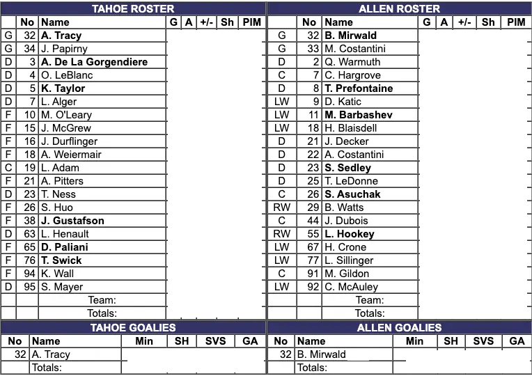 Nine minutes into the second period, the Tahoe Knight Monsters scored to take the lead. Less than a minute later the Tahoe Knight Monsters scored again to take a two-goal lead. With three minutes left in the period, Tahoe was called for roughing. At the same time, the Allen Americans were called for roughing. At the end of the period, Allen was called for roughing. The Tahoe Knight Monsters were leading the game 3-1 going into the third period.