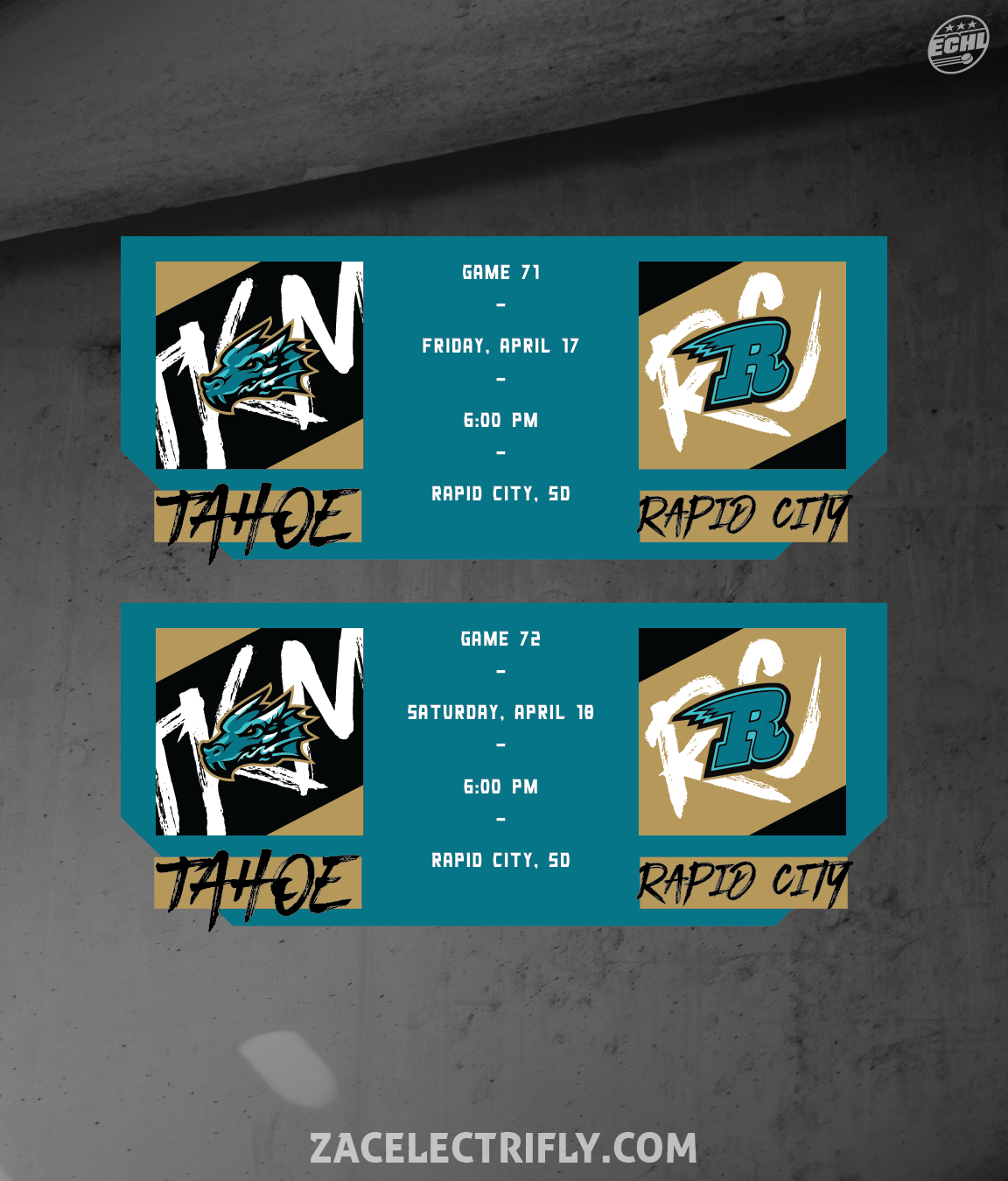 The Tahoe Knight Monsters are taking on the Rapid City Rush for two games in South Dakota this weekend. The first game will be on Friday, April 17th, 2026. The start time for that game is scheduled for 6:00 PM. The second game of the back-to-back will be on Saturday, April 18th, 2026. The start time for that game is scheduled for 6:00 PM. Both games will be at The Monument in Rapid City, South Dakota.