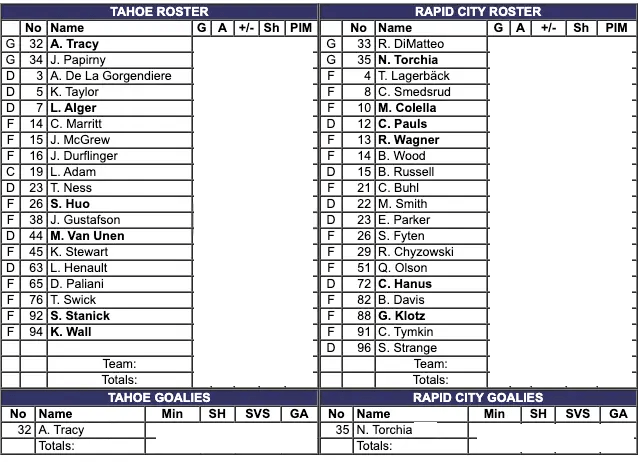 Alex Tracy got the start in net for the Tahoe Knight Monsters. It was his fourth game played for Tahoe this season. Nathan Torchia got the start in net for the Rapid City Rush. It was his tenth game played of the season for Rapid City.