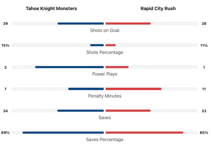 The Tahoe Knight Monsters outshot the Rapid City Rush 39-38. The Knight Monsters had the better shot percentage. Tahoe went 0 for 3 on the power play. Rapid City went 1 for 1 on the power play. Tahoe had two penalties totalling in seven minutes. Rapid City had four penalties totaling eleven minutes. Alex Tracy saved 34 of 38 shots for a 895 Save percentage for Tahoe. Nathan Torchia saved 33 of 39 shots for a save percentage of 85% for Rapid City.