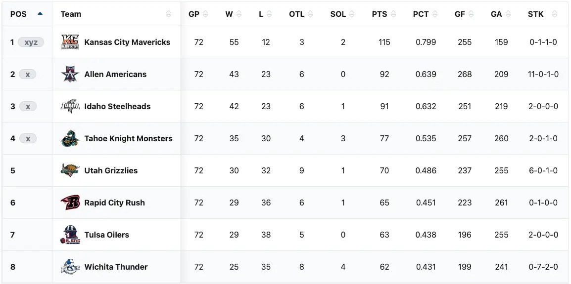 The Tahoe Knight Monsters finished the regular season with a record of 35-30-7 with 77 points after 72 games. The Knight Monsters finished the regular season in fourth place in the ECHL Western Conference Mountain Division. The Knight Monsters finished in eighteenth place overall in the ECHL. The Knight Monsters finished ninth in the Western Conference. Tahoe finished seven points into a playoff spot. That is the largest gap between fourth and fifth place in any ECHL division this season. Tahoe finished 38 points back from the top spot in the division, conference, and overall league standings. Tahoe would have missed the playoffs if they were in the Eastern Conference’s North Division or the Western Conference’s Central Division. In the overall league standings, the Kalamazoo Wings, the Trois-Rivières Lions, and Worcester Railers all finished ahead of the Tahoe Knight Monsters but did not qualify for the playoffs. The Savannah Ghost Pirates are the only playoff team to finish the regular season behind Tahoe in the overall standings. The Tahoe Knight Monsters had six more wins last season. They had five fewer losses. They had one fewer overtime or shootout loss. They had eleven more points last season. The finished one spot lower in the division standings compared to last season. They finished four spots lower in the conference standings compared to last season. They finished eight spots lower in the league overall compared to last season. There was a noticeable drop-off in performance this season. The Tahoe Knight Monsters will be a number four seed going into the ECHL Kelly Cup Playoffs. The Tahoe Knight Monsters first-round playoff opponent will be the Kansas City Mavericks.