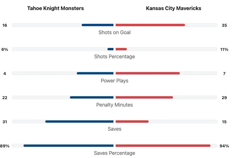 The Kansas City Mavericks outshot the Tahoe Knight Monsters 35-16. The Mavericks had the better shot percentage. Tahoe went 0 for 4 on the power play. Kansas City went 2 for 7 on the power play. Tahoe had 11 penalties totaling 22 minutes. Kansas City had 9 penalties totaling 29 minutes. Alex Tracy saved 31 of 35 shots for a 89% Save percentage for Tahoe. Jack LaFontaine saved 15 of 16 shots for a save percentage of 94% for Kansas City.