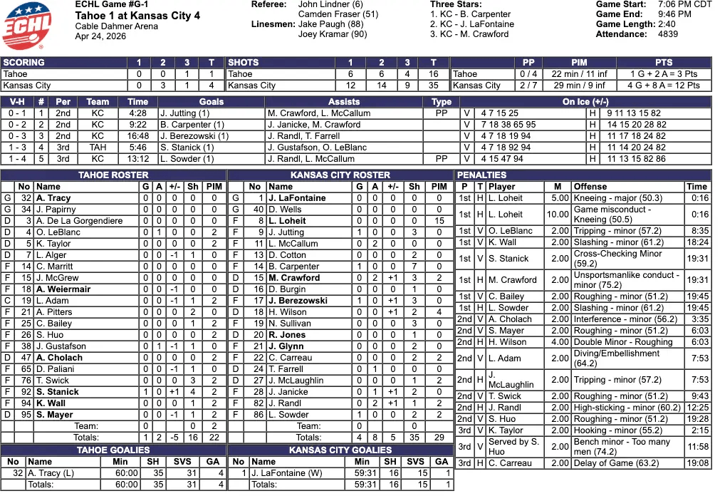 Tahoe attempted to respond early in the final period, managing to get on the board and briefly injecting life into their comeback hopes. However, that momentum was short-lived. Kansas City answered later in the period with another goal, effectively shutting the door and eliminating any realistic chance of a Knight Monsters rally. In the end, it was that dominant second period—those three unanswered goals—that ultimately decided the game.