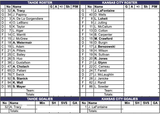 Six minutes into the second period, Samuel Mayer of Tahoe was called for roughing. At the same time, Hudson Wilson of Kansas City was given a double minor for roughing. Seven minutes into the second period, Luke Adam of Tahoe was called for embellishment. At the same time, Jake McLaughlin of Kansas City was called for tripping. Nine minutes into the second period, Bobo Carpenter scored for the Mavericks. His goal was assisted by Justin Janicke.